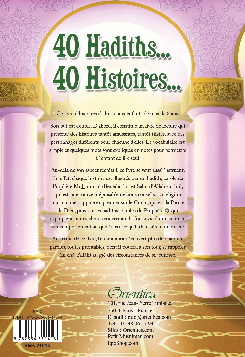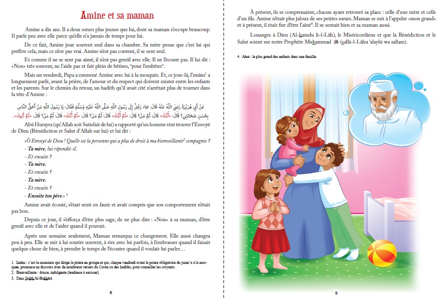 Ce livre d’histoires s’adresse aux enfants de plus de « 8 ans ». Son but est double. D’abord, il constitue un livre de lecture qui présente des histoires tantôt amusantes, tantôt tristes, avec des personnages différents pour chacune d’elles. Le vocabulaire est simple et quelques mots sont expliqués en notes pour permettre à l’enfant de lire seul.Au-delà de son aspect récréatif, ce livre se veut aussi instructif. En effet, chaque histoire est illustrée par un hadith, parole du Prophète Muhammad (Bénédiction et Salut d’Allah sur lui), qui est une source inépuisable de bons conseils. Les références – principalement choisies des livres : «Le jardin des vertueux» (Riyâd As-Sâlihîn) de l’imâm An-Nawawî et le sommaire de Sahîh Al-Bukhârî – en sont données en notes.