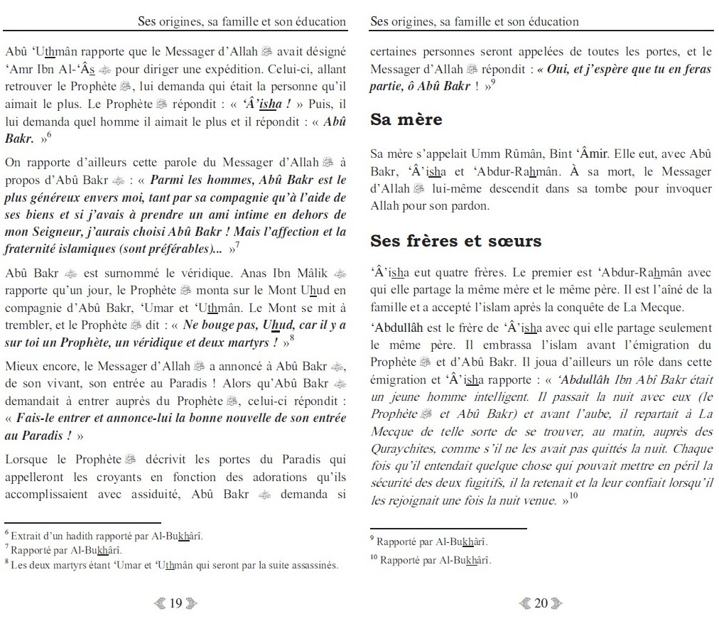 Ce livre décrit aussi son environnement familial, sa vie conjugale auprès du meilleur des hommes, le Messager d’Allah‹. Il dresse également le portrait complet de ‘Â’isha, la femme la plus érudite et la meilleure enseignante qu’ait connue notre communauté. Sont évoqués également son caractère, ses savoirs, sa piété, ses mérites et sa vie religieuse.