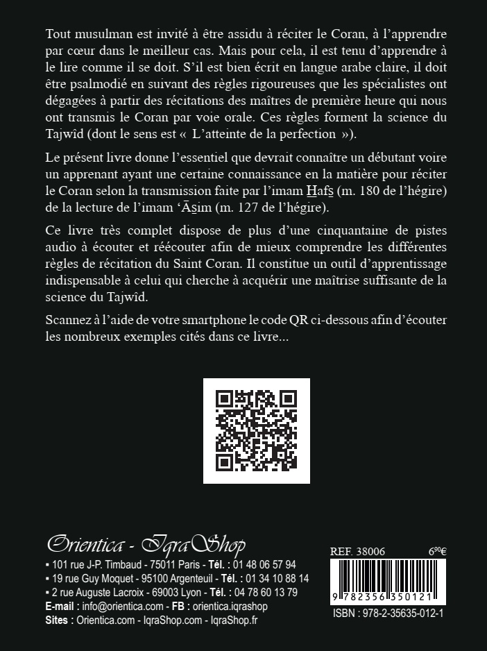 Le présent livre donne l’essentiel que devrait connaître un débutant voire un apprenant ayant une certaine connaissance en la matière pour réciter le Coran selon la transmission faite par l’imam Hafs (m. 180 de l’hégire) de la lecture de l’imam ‘Âsim (m. 127 de l’hégire).