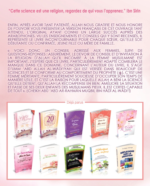 » … Voici donc un conseil adressé aux femmes suivi de questions/réponses : Assurément, le devoir de conseil et d’invitation à la religion d’Allah qu’il incombe à la femme envers ses soeurs est important. Et j’espère que ce livre, particulièrement adapté, comblera le manque dans ce domaine.