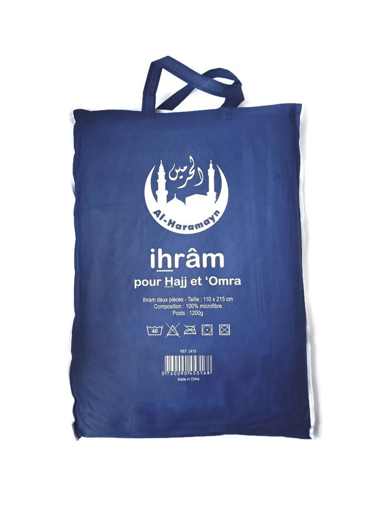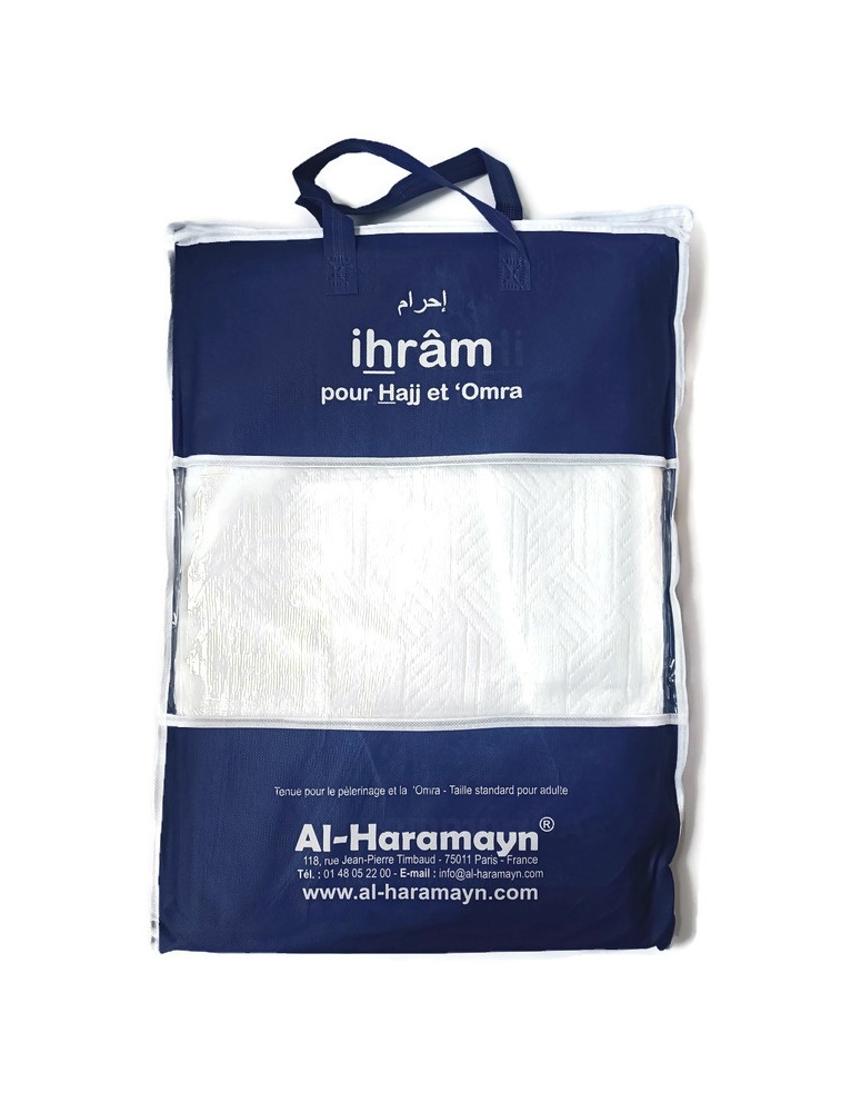 Ihram 1200g de qualité et confortable à composition 100% micro-fibre avec son sac de transport. Très absorbant pour la sueur et très doux. De la marque Al-Haramayn.