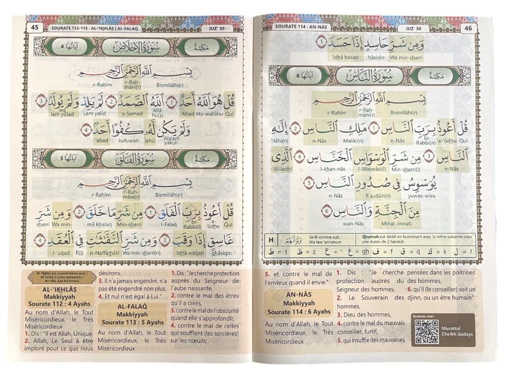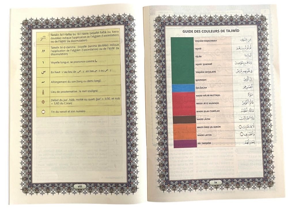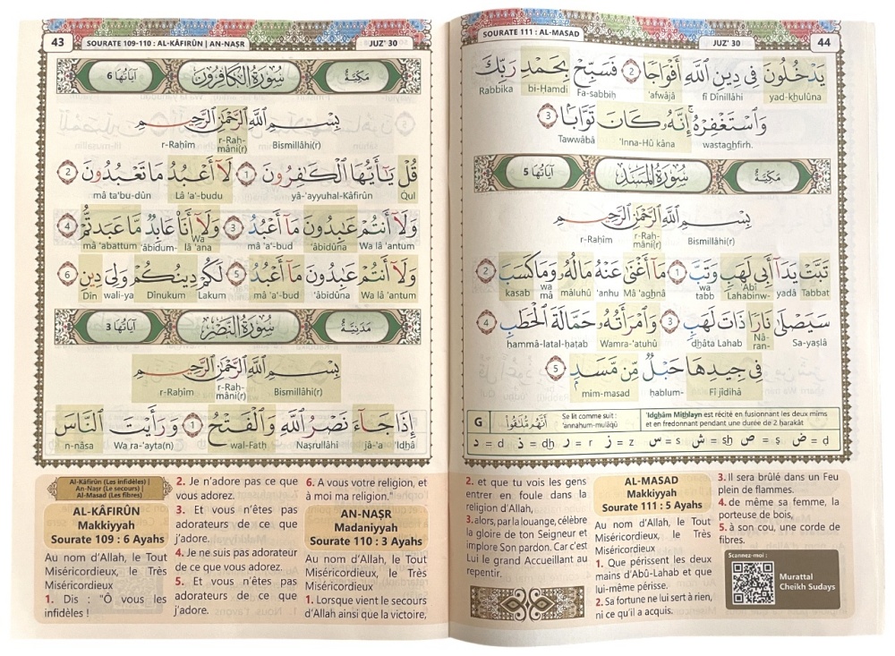 Les règles de tajwid sont données par un système de couleur intuitif pour apprendre les règles de lecture et de psalmodie du Saint Coran et le code QR (présent sur chaque page) permet d’ouvrir une vidéo sur son smartphone et d’écouter et suivre la lecture du Coran par cheikh Soudays.